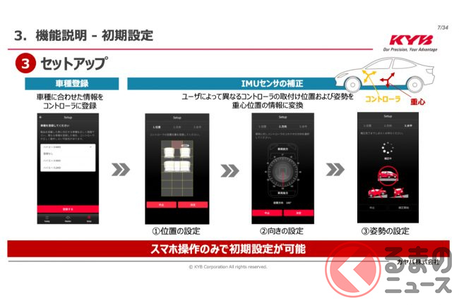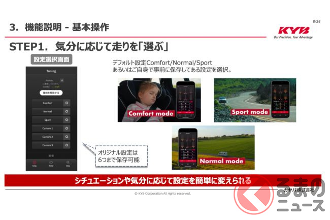 本製品は、これまでの「足回りのセッティングは専門知識が必要」という常識を覆し、アプリひとつで走行シーンに合わせた乗り心地を瞬時に切り替えられる、カヤバ初のアフターマーケット向け電子制御サスペンションシステムです。