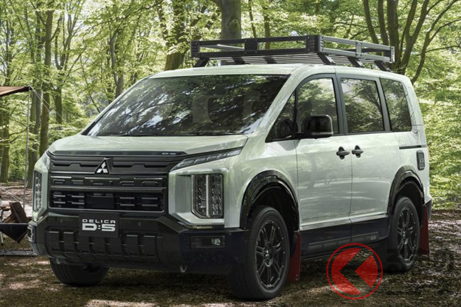 三菱「新型デリカD:5」発売! “ランエボ譲り”のスゴい4WD搭載! めちゃ力強い「立体グリル」も採用! 超タフな“黒顔”&ルーフキャリア完備の「ワイルドアドベンチャースタイル」に大注目!