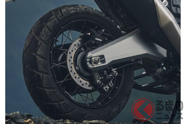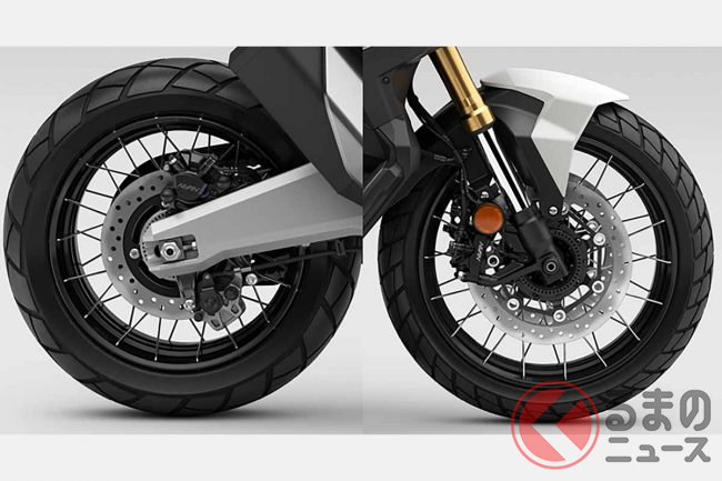 足元には、アドベンチャーテイストあふれるアルミ製のスポークホイール(チューブレス仕様)とブロックパターンタイヤを装備。フロント17インチ、リア15インチの組み合わせで、走破性とラゲッジスペース容量を両立させています。