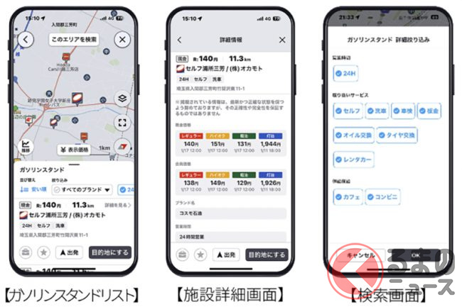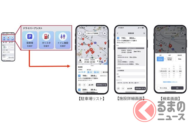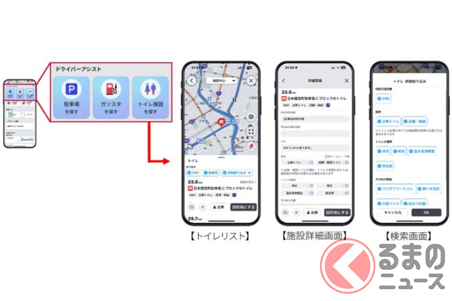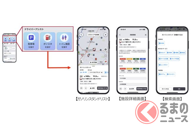 今回のアップデートでは、駐車場やガソリンスタンド、トイレをより細かい条件指定で探せるようになりました。