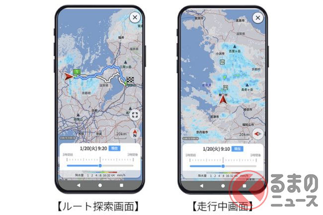 なお今回のアップデートでプレミアムプランでは、ルート探索画面と走行中画面の地図上にアメダス降雨情報の表示が可能になりました。降雨情報を確認しながら、天候に合わせて出発時間や走行ルートなどの移動プランを調整・変更できます。