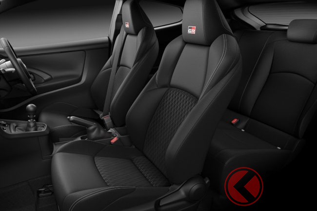 インテリアも、ベーシックなヤリスとは仕様が大きく異なります。黒を基調とし、インパネセンタークラスター、シフトベゼル、レジスターベゼルには、つや消しブラック塗装が施されています。