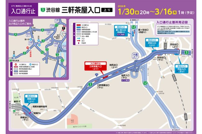 首都高3号渋谷線でも、上りの三軒茶屋入口がETC専用化に向けて工事が行われており、3月まで入口閉鎖が予定されていますが、この影響で国道246号が混雑します。