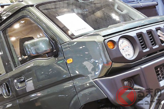 丸型ヘッドライトと5スロットグリルというジムニーのアイコニックな表情を完璧に再現しており、知らない人が見れば「4ドアのジムニーが出たのか?」と見紛うほどの完成度を誇ります。