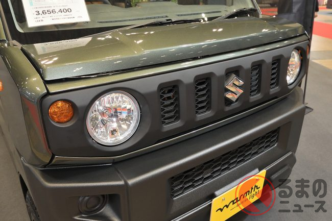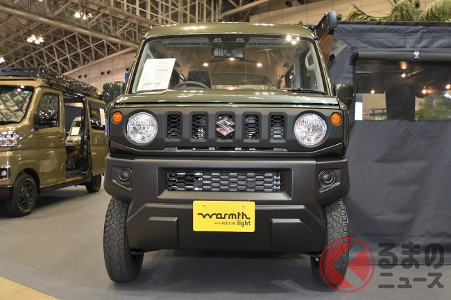 展示されていたのは、「ウォームスライト ジムリイ カスタムパッケージ」。その名の通り、スズキの軽ワンボックス「エブリイ」をベースに、同社の軽本格四駆「ジムニー」のフロントフェイスを移植した、「ジムリイ」と呼ばれるカスタムモデルです。