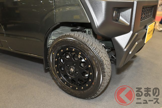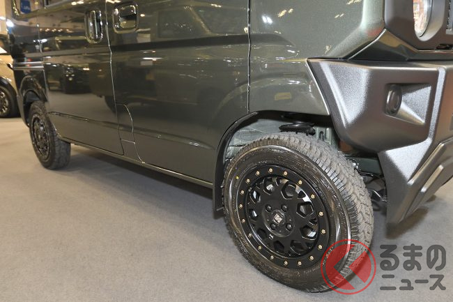 さらに、足回りには約1.5インチのリフトアップサスペンションを組み込み、14インチのアルミホイールとオフロードタイヤを装着。トータルで約5cm車高を上げた「ちょい上げ」スタイルにより、悪路走破性の向上だけでなく、タフでワイルドな雰囲気を強調しています。