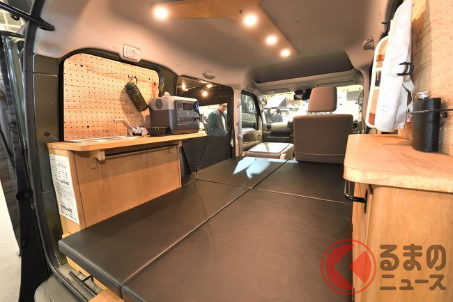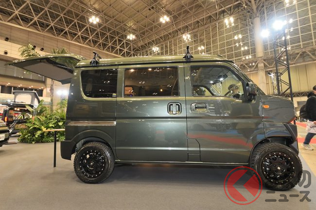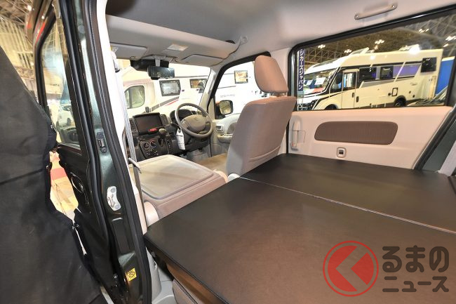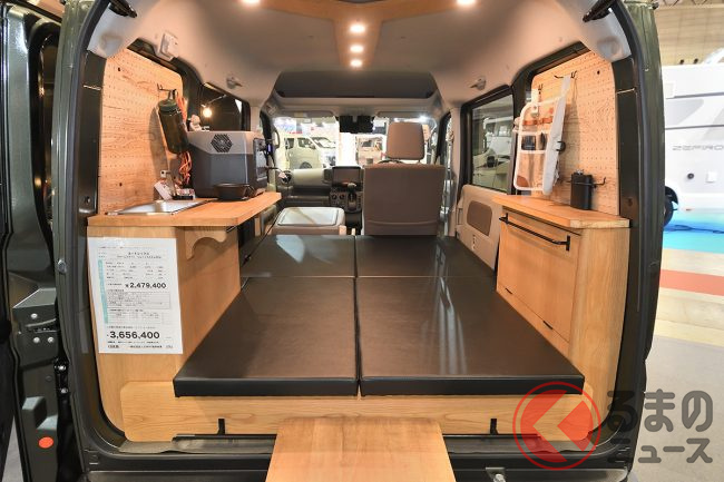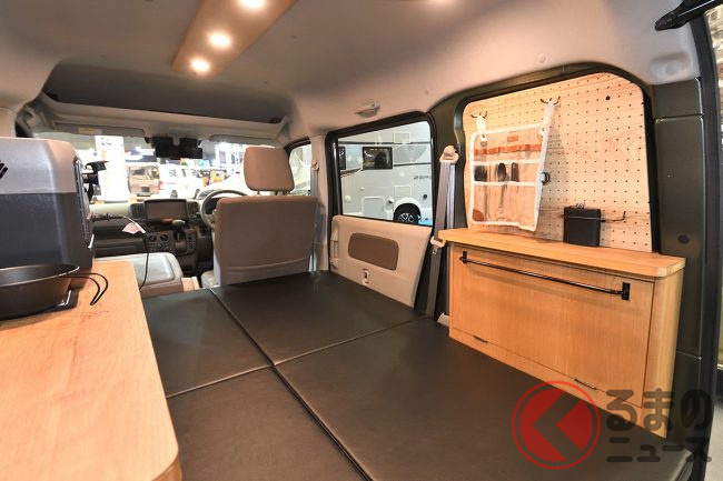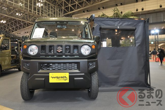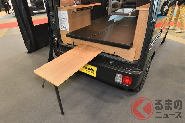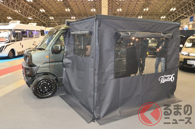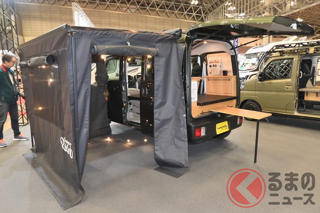 ちなみに、会場に展示されたサイドオーニング付き・ジムニー顔のカスタムパッケージ仕様でも365万6400円(JOIN・2WD)と、依然としてキャンピングカーとしては非常に手の届きやすいプライスタグを提示していました。
