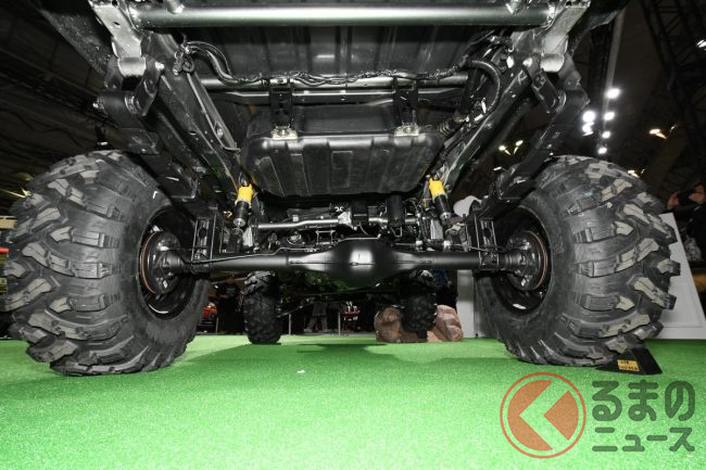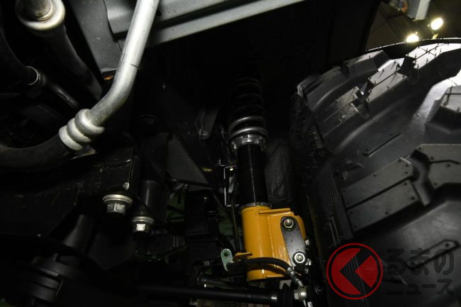また、足回りには大幅なリフトアップとワイドトレッド化が施されており、それにともない、タイヤも「MORIZO」「ROOKIE Racing」といいホワイトレターが入れられた肉厚のマッドタイヤへと交換されています。