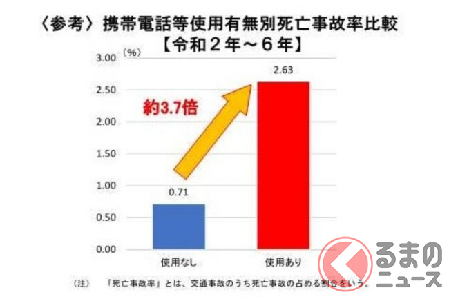 しかし、2021年以降は増加傾向にあり、2024年の携帯電話等使用による死亡・重傷事故件数は136件。携帯電話等使用の事故の場合、使用なしと比較して死亡事故率が約4倍高い点も見逃せません。