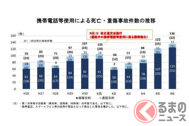 警察庁によると、スマホ画面の注視など携帯電話使用等に起因する交通事故は、罰則等を引き上げた改正道路交通法が2019年12月に施行された影響もあり、2020年は大幅に減少しました。