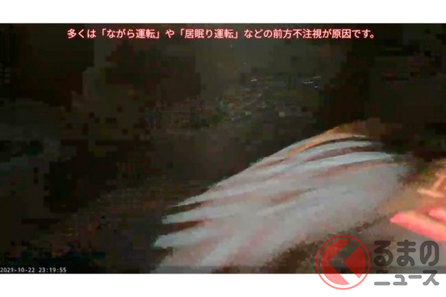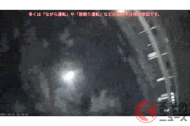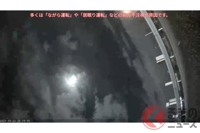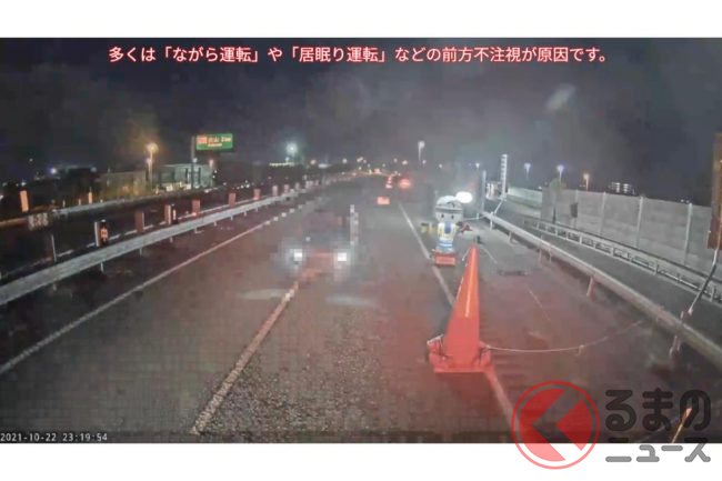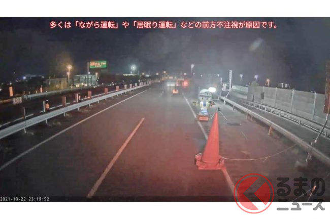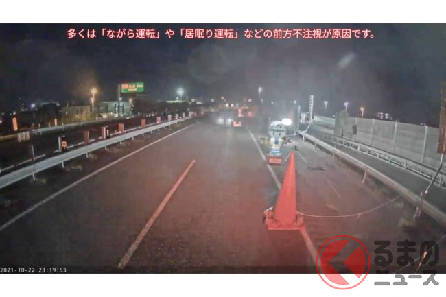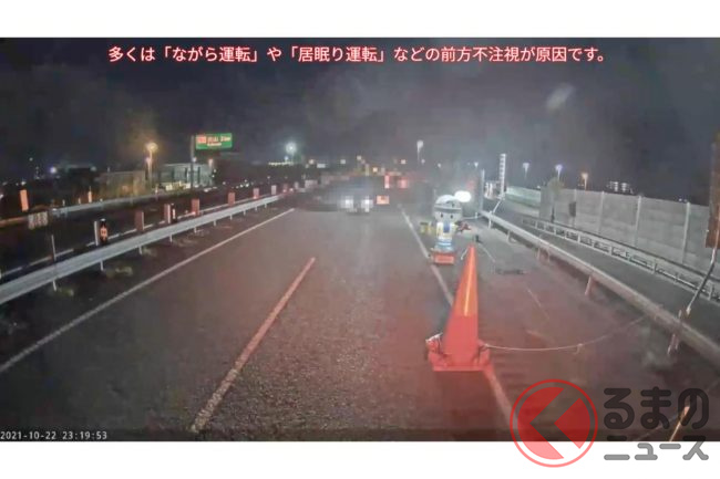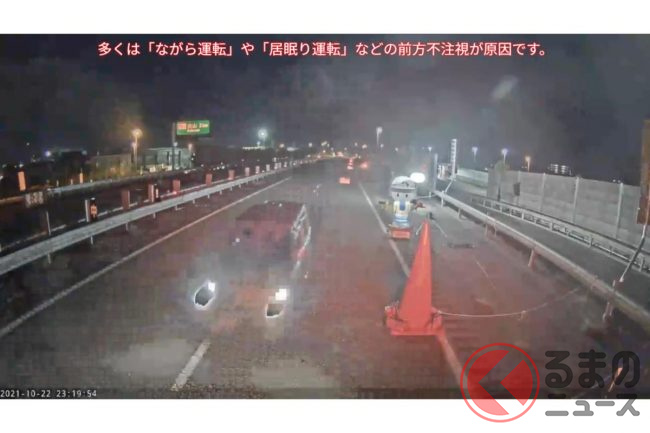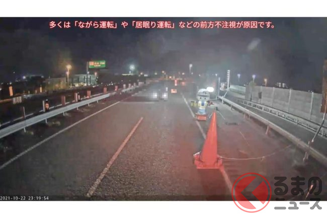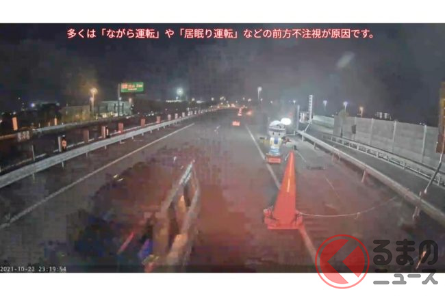 「すごい事故…」 NEXCOが「激しい追突事故」の動画を公開! 軽ワゴンが「工事に気づかず?」工事車両に“激突・大破”… 夜の北陸道で起きたクラッシュを投稿 工事規制事故多発で警鐘