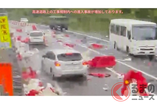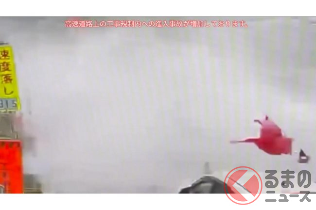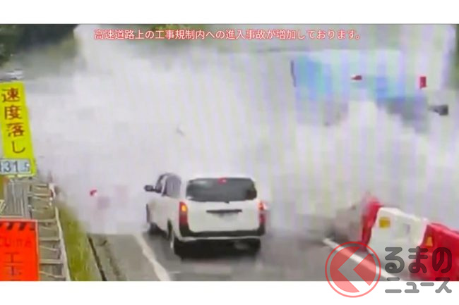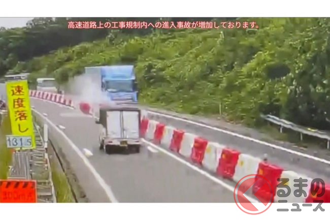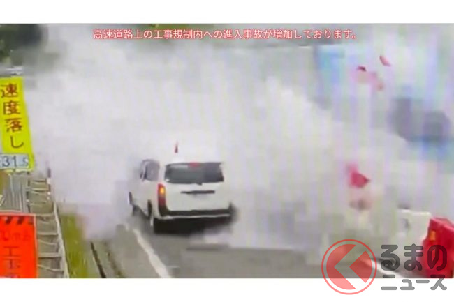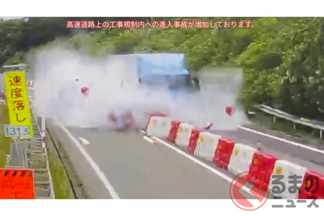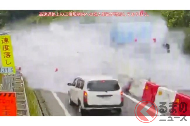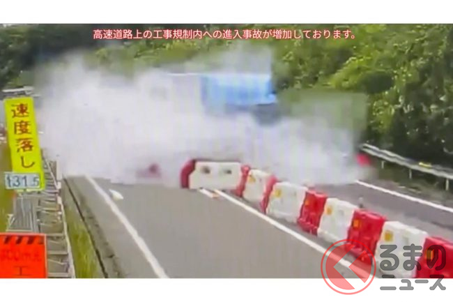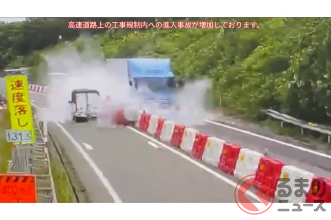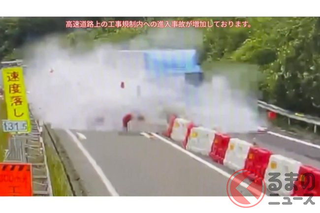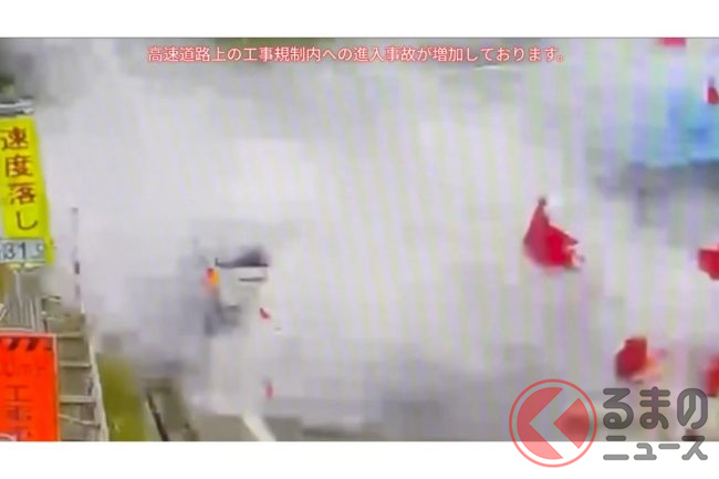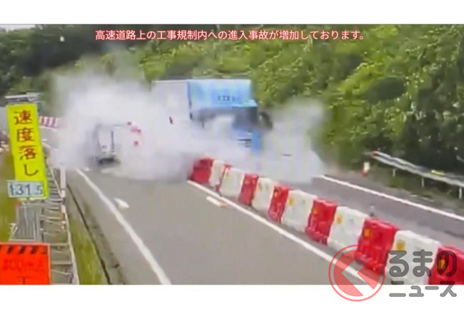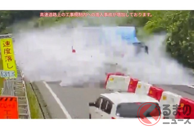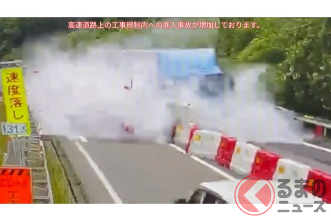 高速道路の工事規制区間で発生した工事車両への衝突事故の動画を公開しました。一体何が起きたのでしょうか。