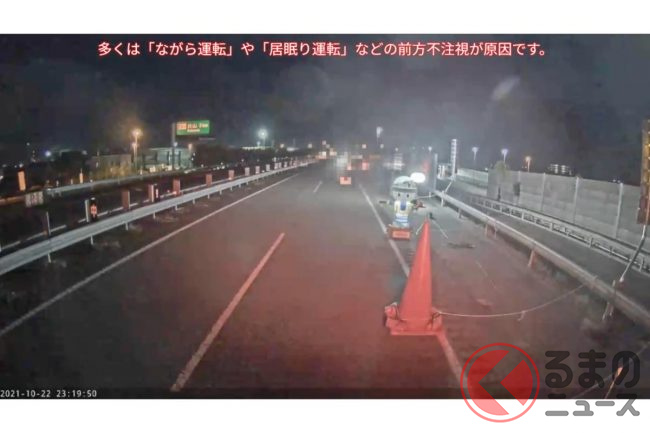 そもそも高速道路で工事を行う場合は、現場の直前で突然規制するのではなく、少なくとも2km程度手前から複数回、予告がなされます。