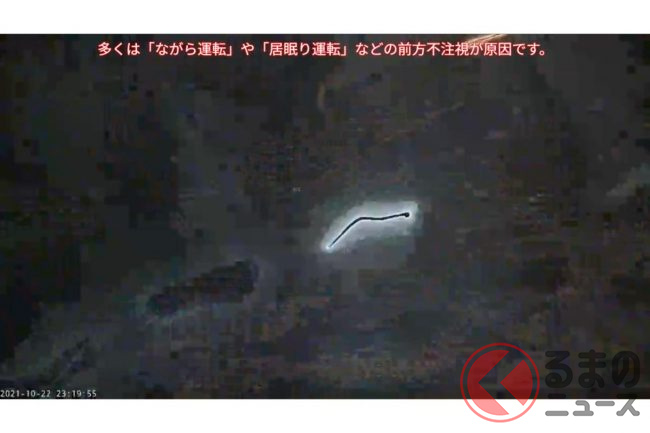 4車線区間のうち、上り線側の第一走行車線で工事が行われているようで、映像は工事車両の後部に装着されたドライブレコーダー映像のようです。映像の日付は2021年10月22日の23時19分となっています。