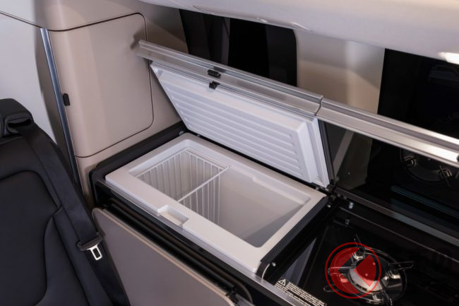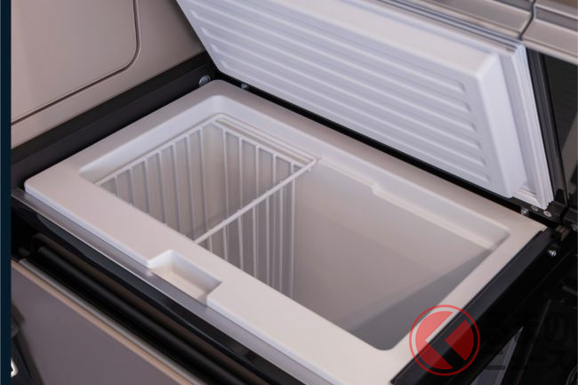 また、居住スペースのキッチンユニット周りも改良されました。よりスムーズに開閉できる引き出し収納や折りたたみ式テーブル、さらにエネルギー効率に優れたクーラーボックス(冷蔵庫)も装備され、長時間の滞在でも快適に過ごせる工夫が凝らされています。