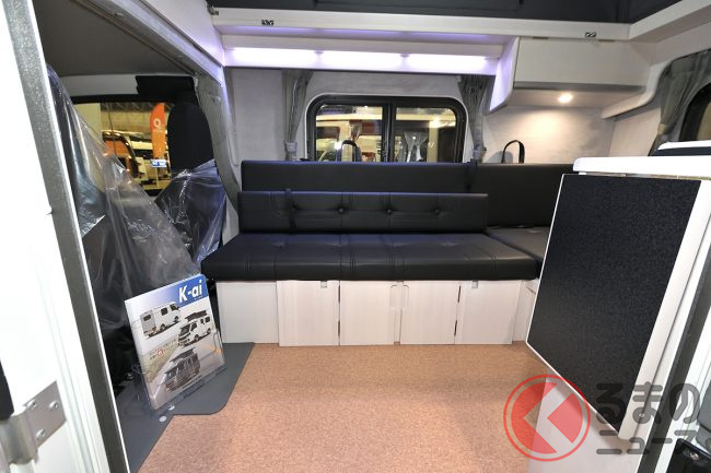 K-aiはベース車によって室内レイアウトに「対面タイプ」「ベンチタイプ」を選べますが、今回展示されたダイハツ「ハイゼットトラック」ベースのタイプDの場合、居住スペース内のシートが横方向を向くベンチタイプのみの設定となります。