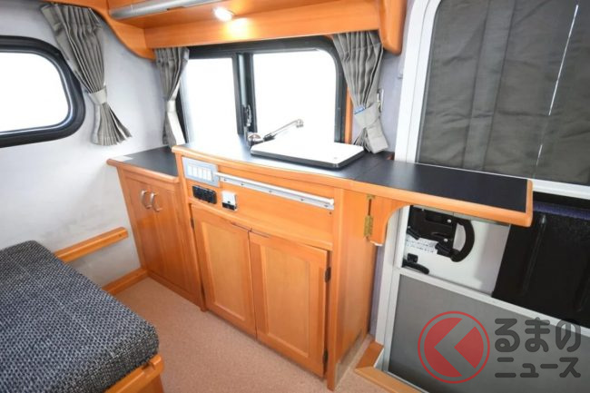 ベンチシートの反対側にはシンク付きのキッチンを装備しており、小さいながらも本格的なキャンピングカーに仕上がっています。