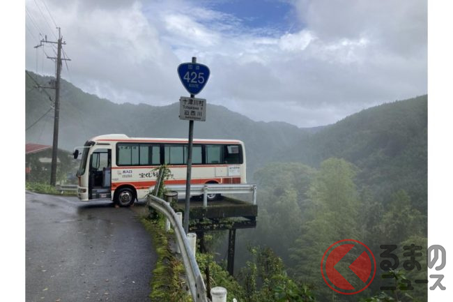 国道425号は、急峻な線形かつ道幅も狭い国道である「酷道」として特に有名な道路で、ほぼ全線で普通車であってもすれ違いが困難であるほか、ガードレールもなく、落石も多いという過酷な道路です。