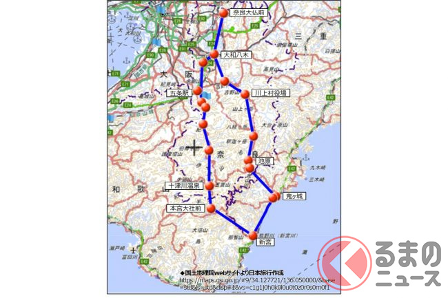2026年3月14日に出発するツアーで、現在日本国内で運行される一般バス路線としては最長となる奈良交通「八木新宮線」の区間も踏破します。
