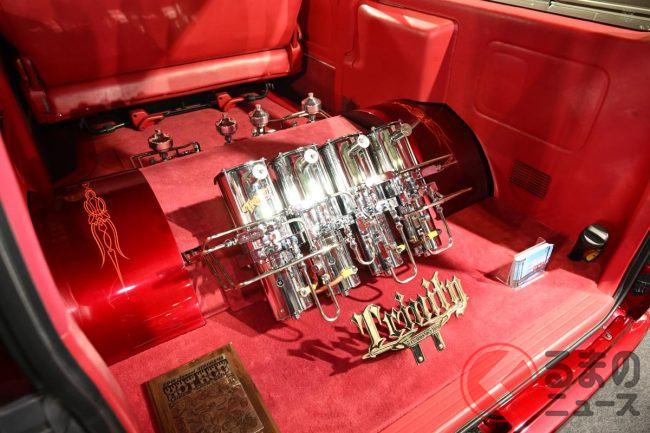 また、エクステリアやインテリアも全体的に赤で統一し、ホイールからエンジンに至るまで、ほぼすべてのパーツにアメリカ車用のものを採用することで世界観を統一しました。
