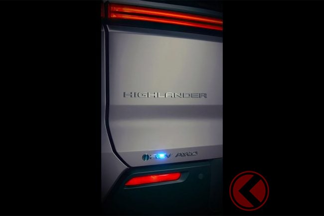 「Meet the all-new 2027 Highlander. Featuring sleek, modern lines, an electric powertrain, and a spacious three-row cabin with comfort for the whole crew.(新型2027年型ハイランダーをご覧ください。洗練されたモダンなライン、電動パワートレイン、そして乗員全員が快適に過ごせる広々とした3列シートのキャビンを備えています。)」というコメントともに公開されたティザーでは、ハイランダーのエンブレムを映したもので、「HEV AWD」のバッジも映り込んでいます。