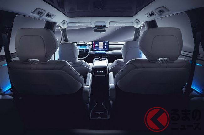 ライトグレーを基調としたモダンなデザインで、インパネには新型RAV4のような大型モニターが装備されており、またナイトドライブを盛り上げるアンビエントライトも備わっています。