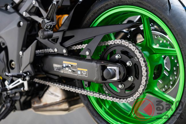 車体には、マスの集中化を高い次元で達成した高剛性アルミツインチューブフレームを採用し、シャープな旋回性能と安定感のあるハンドリングに貢献しています。サスペンションには、快適性とスポーティな性能を両立するショーワ製SFF-BPフロントフォークとホリゾンタルバックリンクリアサスペンションを装備。加えて、チェーン調整機構が従来のエキセントリック式からリアアクスルアジャスターに変更されたことで、メンテナンス性が向上しています。
