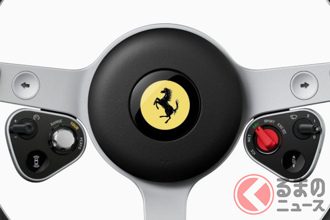 新型「スポーツカー“ルーチェ”」初公開! “iPhone”デザイン内装×「旧車風」ステアリング採用! 新型「フェラーリ」の内装が伊国でお披露目