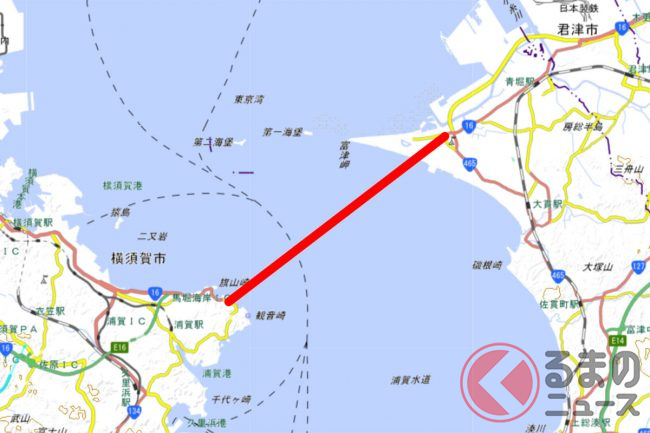 名称の通り、東京湾の入口である神奈川県横須賀市と千葉県富津市をつなぐもので、このエリアは東京湾内最狭の「浦賀水道」となっています。