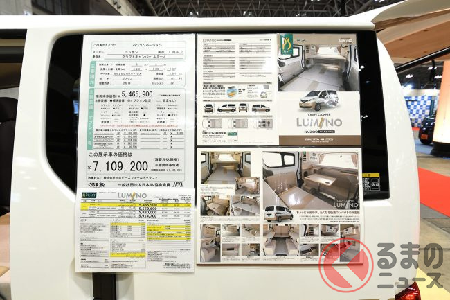 日産ピーズフィールドクラフトは、「ジャパンキャンピングカーショー2026」に日産「セレナ」ベースの車中泊仕様車と、「NV200バネット」ベースのニューモデル「LUMINO(ルミーノ)」を展示しました。