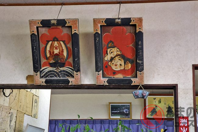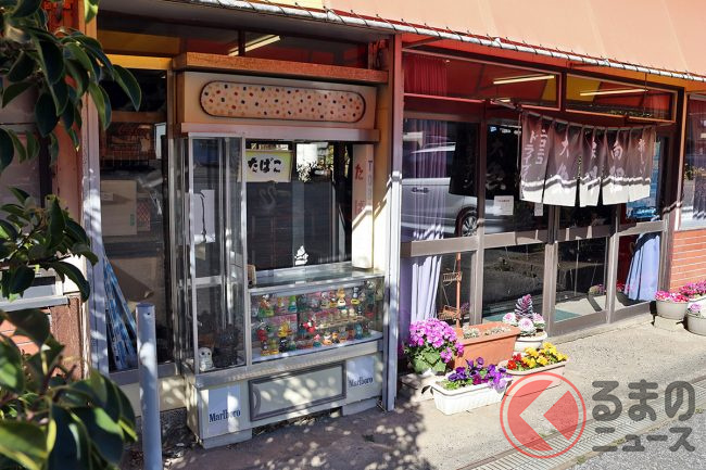 “昭和感”あふれるレトロな看板は、錆びてしまった部分と塗り直した部分(それも昔のことっぽい)が、いい感じのグラデーションになっています。また、往年の「たばこ屋さん」コーナーには、昭和のゆるキャラぽい置物が並んでいて、なんとも味わい深い空間になっていました。