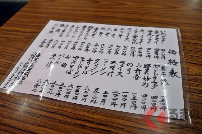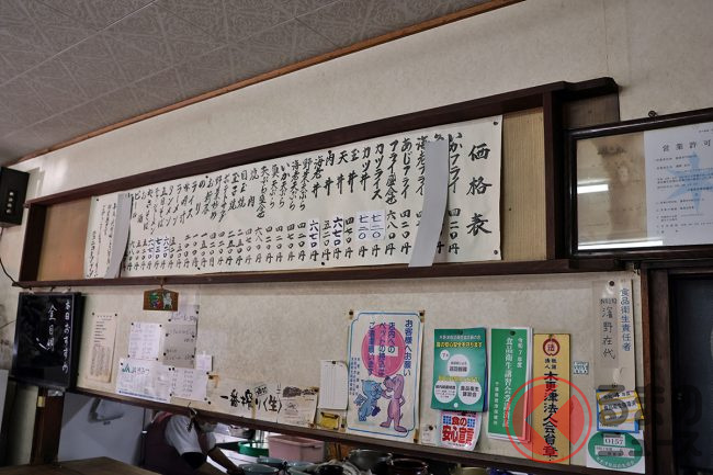 たとえば「ラーメン」は500円、「あじフライ」や「いかフライ」は420円(!)。この店では高価格帯になる「五目そば(730円)」や「天丼(670円)」でも割安感があります。