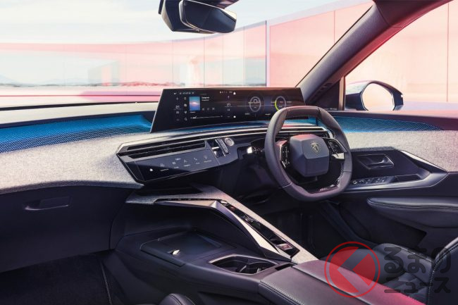 5人乗りのインテリアには、最新の「PEUGEOT Panoramic i-Cockpit」を搭載。21インチの巨大なパノラミックカーブドディスプレイが弧を描くように配置され、未来的な造形と高い視認性を両立しています。