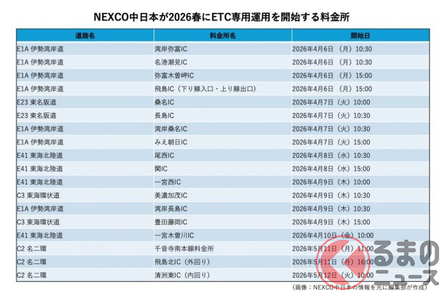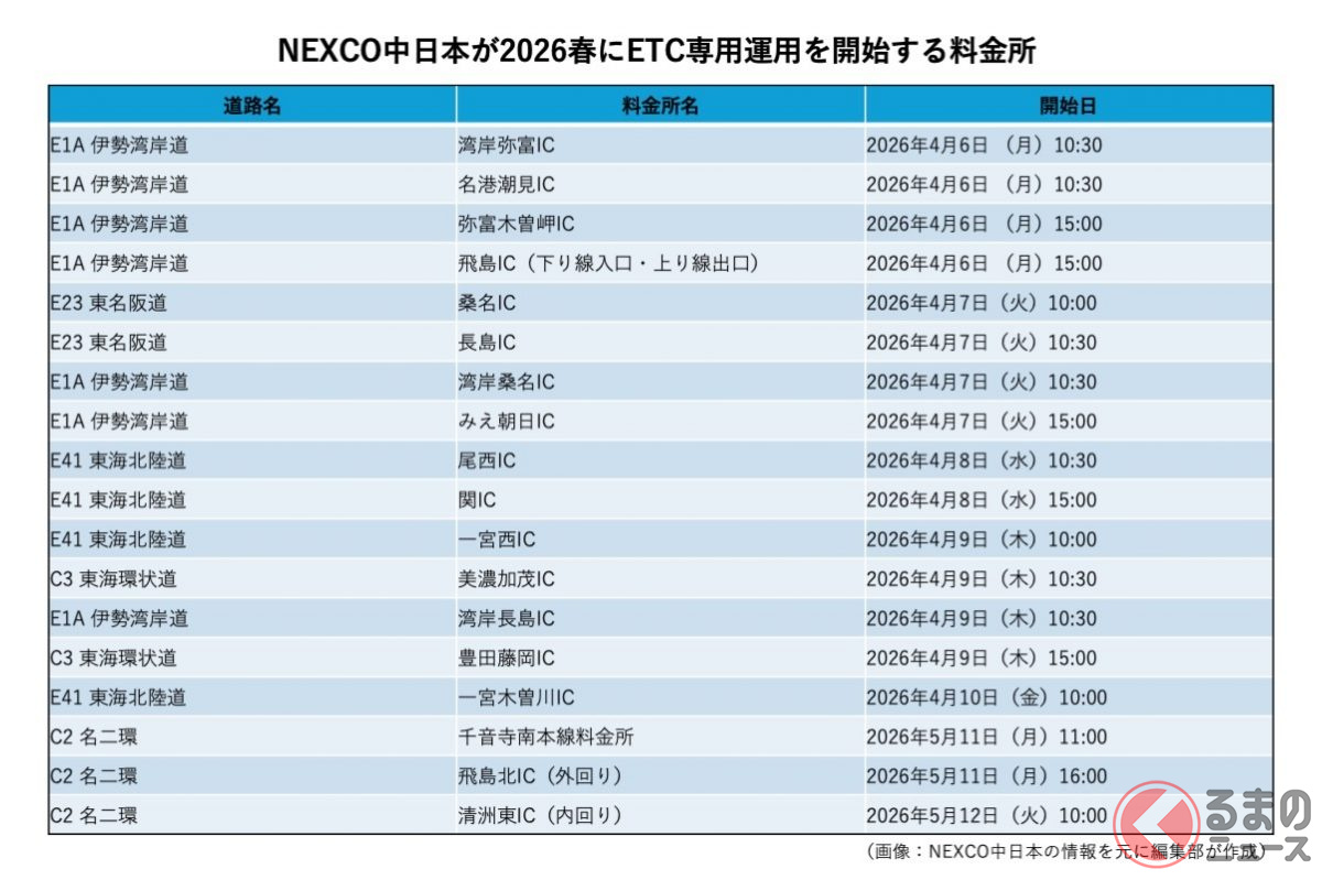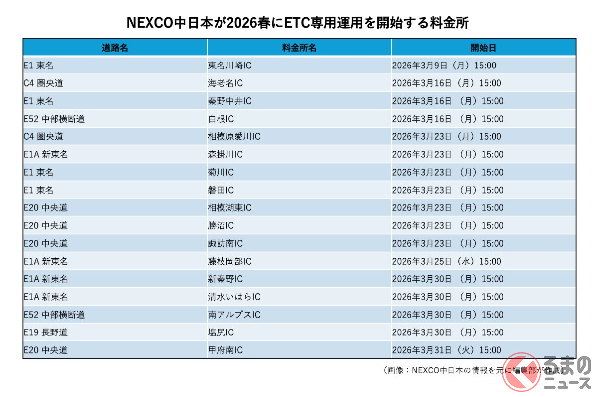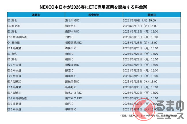 特に注目すべきは、NEXCO中日本が発表した大規模な専用化計画。同社管内では、2026年春から一挙に35か所の料金所がETC専用へと切り替わります(3月9日より順次運用開始)。