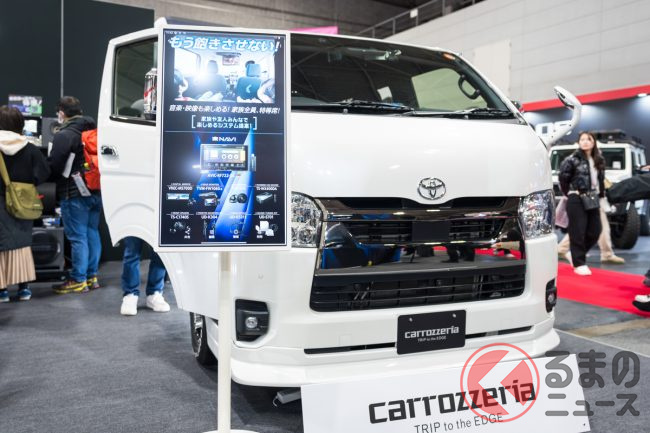 そのほか会場には家族や友人みんなで楽しめるシステムとして、「楽ナビ」をメインユニットに、フロントスピーカーに「TS-C1740S」、リアスピーカーに「TS-E1010」を搭載し、リアモニター「TVM-FW1060-B」を装着した200系ハイエースも展示されました。