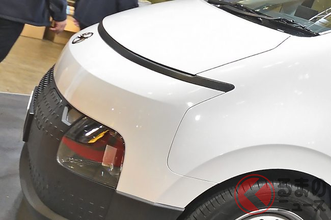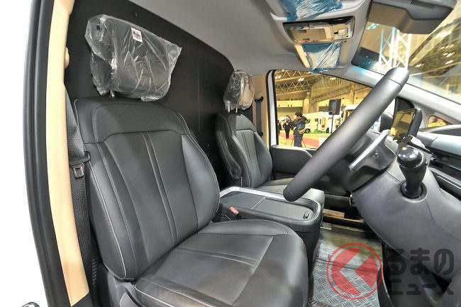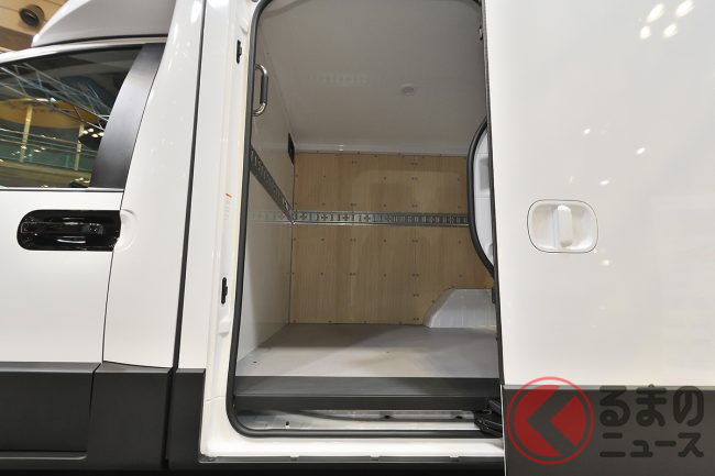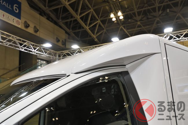 展示車は宅配便のパネルバンのような「ハコ」を背負った簡素な格好でしたが、会場でも実際に架装したイメージをパネルで紹介するなど、ポテンシャルの高さを示していました。