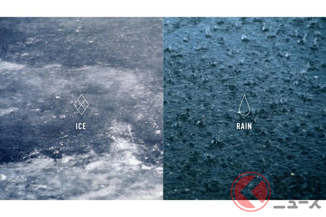 ゴム内部に組み込まれたスイッチが水や温度に反応することで、ドライ、ウェット、雪上、氷上といったあらゆる路面状況に対応します。
