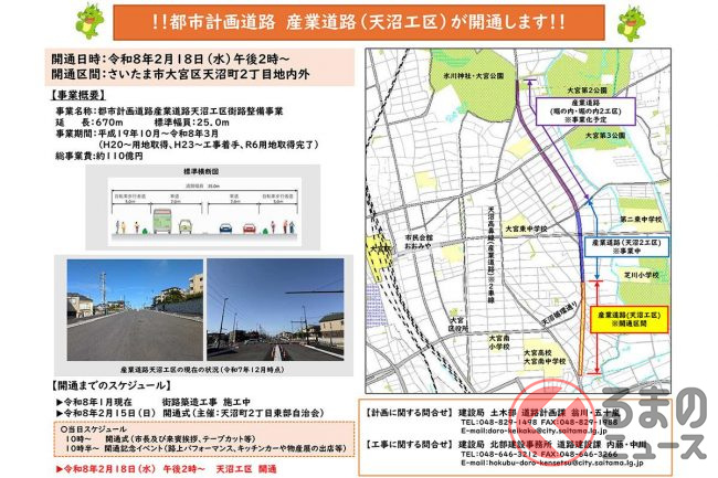 さいたま市大宮区で整備が進められてきた都市計画道路「産業道路(天沼工区)」が、2026年(令和8年)2月18日に開通します。