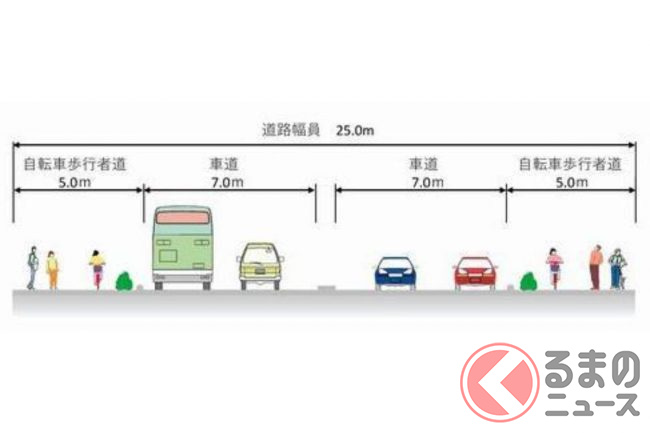 計画幅員は25.0mから27.0mで、車道(7.0m×2)に加え、両側にゆとりある自転車歩行者道(5.0m×2)が配置される構造です。