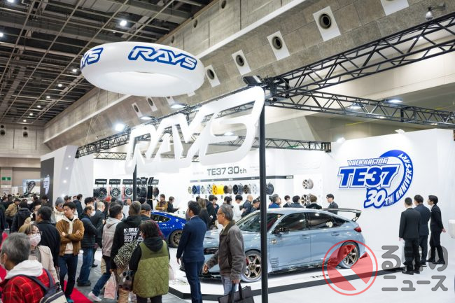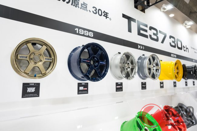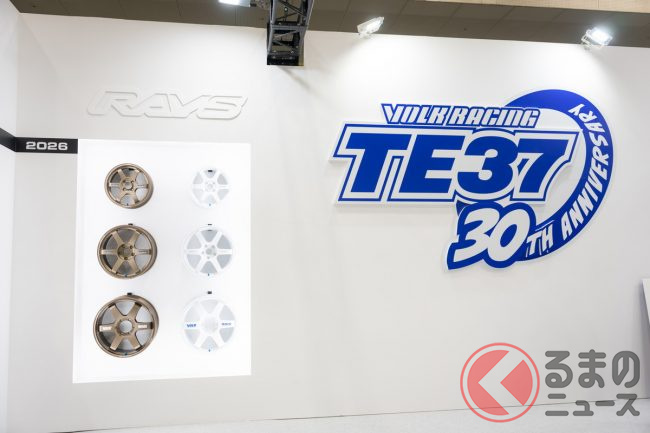 2026年2月13日から15日まで、インテックス大阪(大阪市住之江区)でカスタマイズカーのイベント「大阪オートメッセ2026」が開催されました。イベントには、大阪を本拠とするホイールメーカーのRAYS(レイズ)も出展し、同社を代表するスポーツホイールのひとつVOLK RACING TE37シリーズが30周年を迎えるということで、TE37を中心とした展示がなされました。