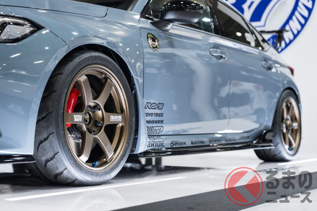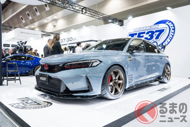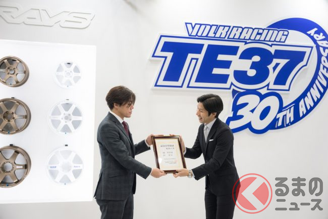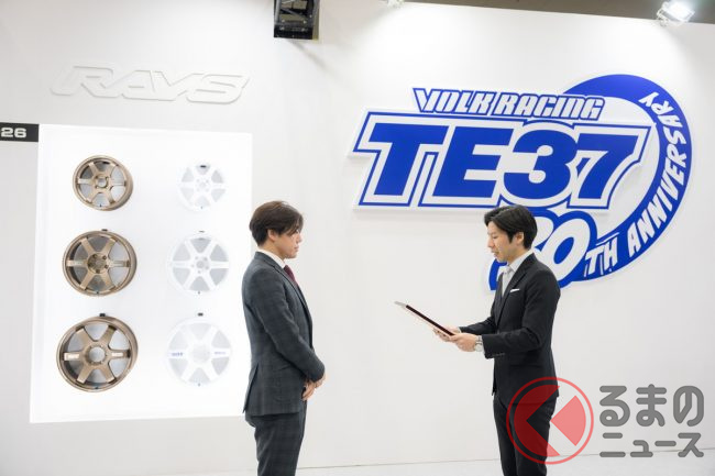 インテックス大阪で開催されたカスタマイズカーのイベント「大阪オートメッセ2026」に、ホイールメーカーのレイズが出展しました。歴代のTE37シリーズが多数展示されるなか、このTE37にちなんだサプライズ発表がありました。