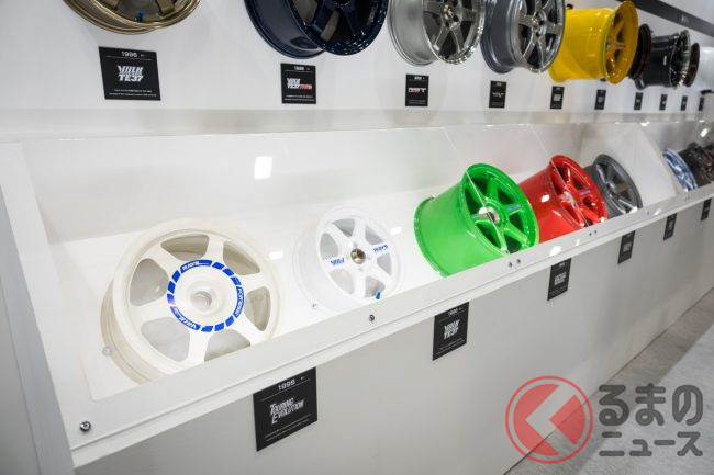 ほかにも会場には、1996年に発表された初代TE37をはじめとして、歴代のTE37シリーズが多数展示されました。なかには、レースマシンに装着されたものやエコカー用に生まれたもの、鍛造マグネシウム製のものなど珍しいホイールもありました。