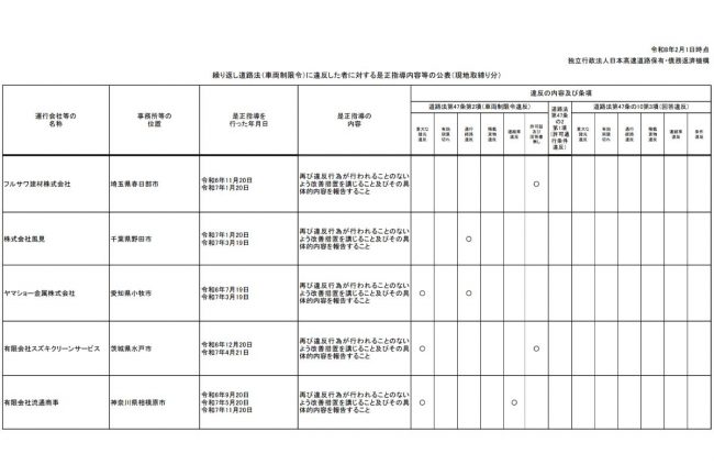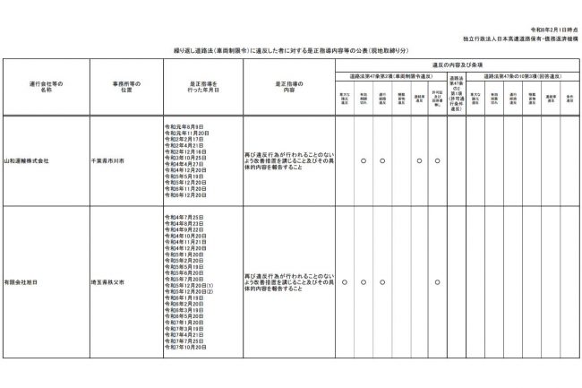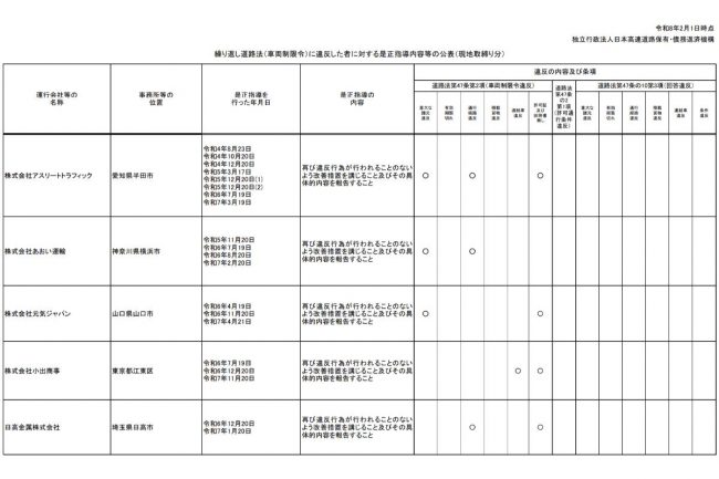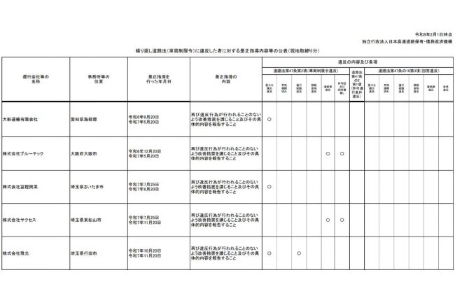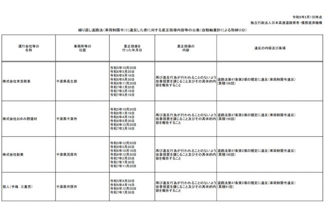 NEXCO西日本および日本高速道路保有・債務返済機構は2026年2月10日、高速道路で「車両制限令」を繰り返し違反した者の事業者名と是正指導の内容を公表しました。