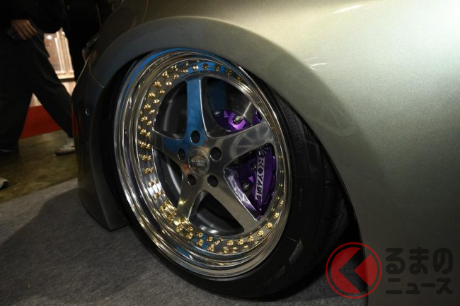 フェンダーぎりぎりまで攻めた大径ホイールとロゼル製エアサスペンションによる低い車高が組み合わさり、独特の存在感を放っています。