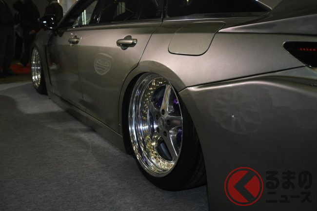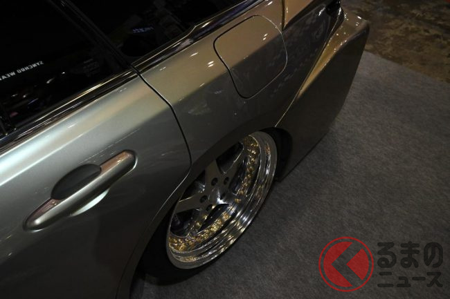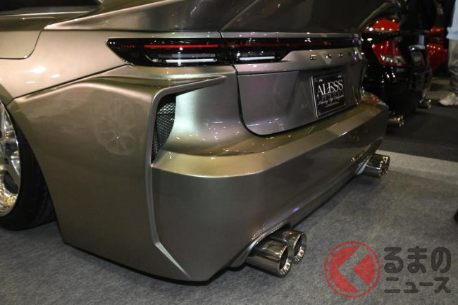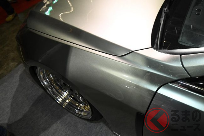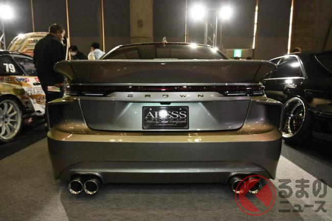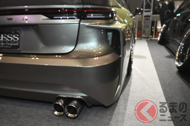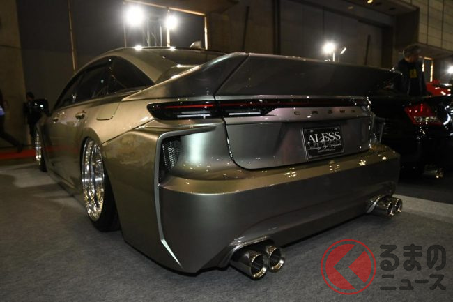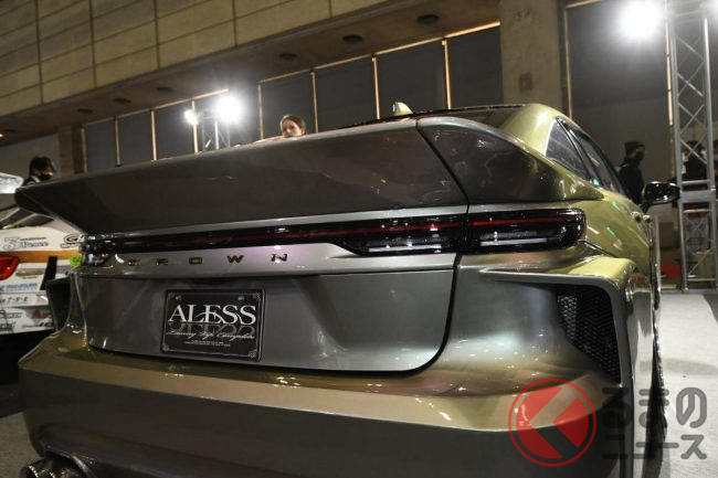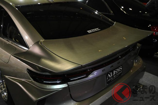 アレスの担当者は、今回の展示車のポイントについて「後方へ少し張り出したリアバンパーが最大のポイントで、ファストバックスタイルのクラウン セダンを、ひと昔前のVIPカーらしいシルエットに近づけています」と説明します。