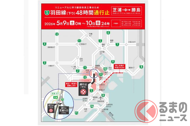 首都高速「1号羽田線」が通行止めに…! 1日7万台通るルートが48時間通れず、なぜ? 迂回は最大80分要する予想も! 5月9日から 下り(芝浦~勝島間)で実施