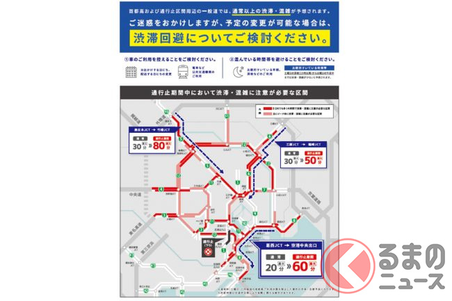 通行止め期間中は、首都高および周辺の一般道で通常以上の混雑が予想されています。