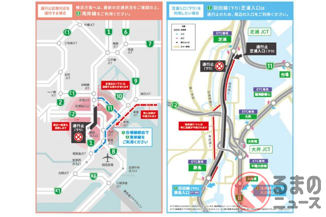 また、芝浦入口(下り)が閉鎖されるため、周辺の入口へ迂回する必要があります。