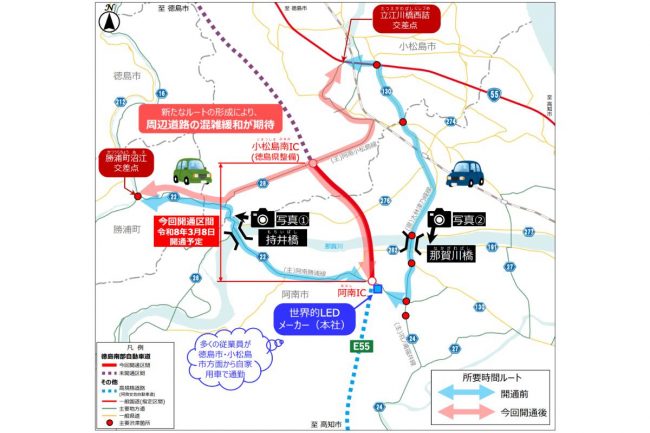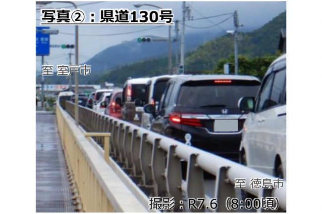 これまで那賀川を越えるには、海側の国道55号に加え、県道130号線(大林津乃峰線)、山側の県道22号線など、少ない橋梁ルートを利用する必要があり、道路のキャパシティが不足し、いずれのルートも大混雑となっていました。