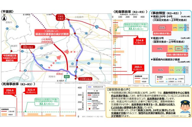 死傷事故発生率が、徳島県内の平均を上回っている状況にあり、交通転換によって混雑が緩和されることで、周辺道路における安全性の向上にも期待されています。